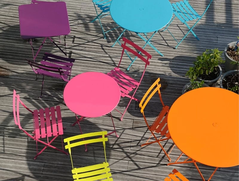 Klappstühle und -tische waren Ende des 19. Jahrhunderts bei Limonadenverkäufern beliebt, da die Möbel leicht wegzupacken waren und sich so die Gebühren für einen festen Stand vermeiden ließen. Die Bistro-Kollektion von Fermob strebt nach Authentizität und basiert auf einem Originalpatent aus dem Jahre 1889. Die klassischen und doch zeitlosen Möbel sind eine gute Wahl für moderne Terrassen, Balkone und Gärten.