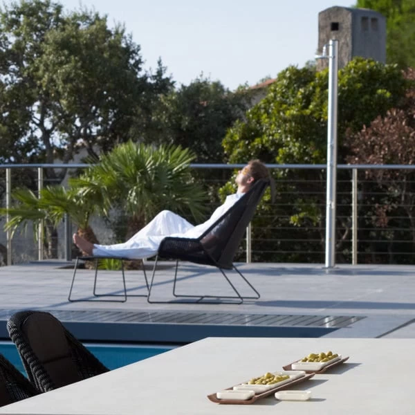 Der Fußhocker Breeze ist ein Design des dänischen Duos Strand + Hvass, also Christina Strand und Niels Hvass. Der Breeze-Fußhocker passt perfekt zum Loungesessel und zum Hochlehnstuhl aus der gleichen Serie. Die Gartenmöbelserie Breeze kombiniert moderne Optik mit hohem Sitzkomfort und möglichst wenig Aufwand bei der Reinigung.