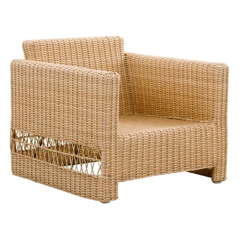 Der Carrie-Loungesessel von Sika-Design ist ein Sessel für den Außenbereich mit einem robusten, kantigen Gestell und einem dekorativen Geflecht aus synthetischem Rattan. Die Sitzkissen sind für den Einsatz im Freien gedacht und haben abnehmbare, maschinenwaschbare Bezüge.