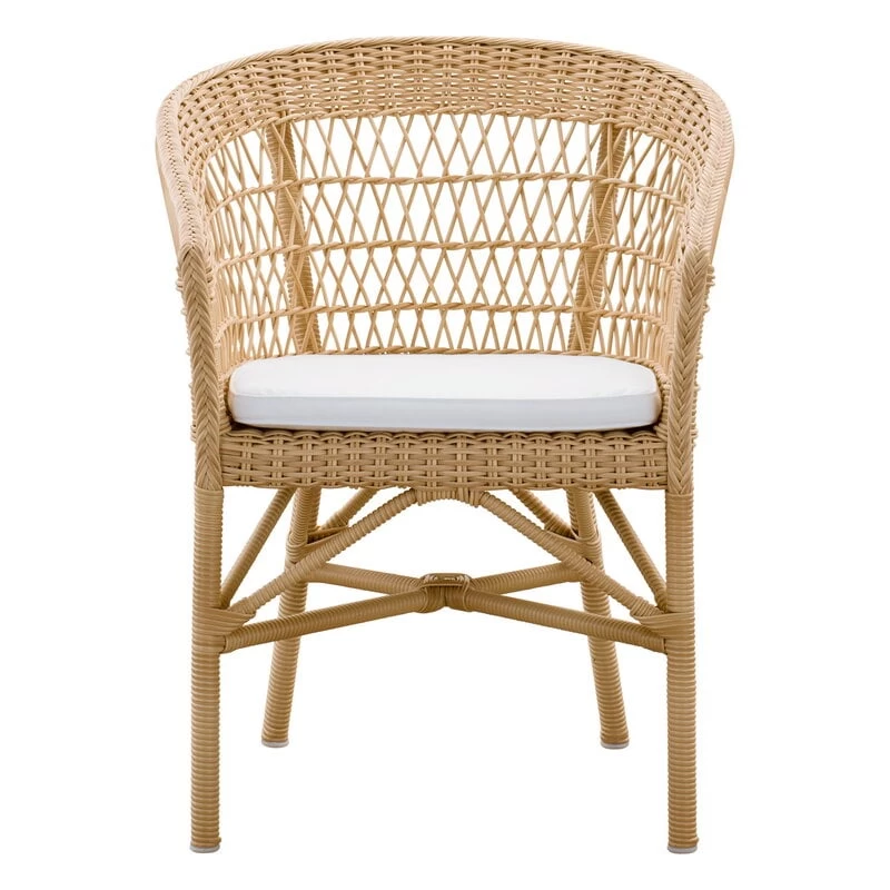 Der Emma-Stuhl von Sika-Design ist ein Esszimmerstuhl für den Außenbereich mit einer sanft geschwungenen Rückenlehne und einem dekorativen Geflecht aus synthetischem Rattan. Das Sitzkissen ist für den Einsatz im Freien gedacht und mit einem abnehmbaren, maschinenwaschbaren Bezug versehen.