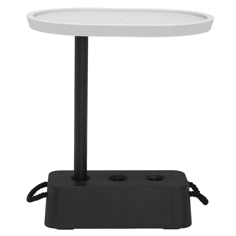 Der Brick-Außentisch besteht aus Metall und Polyethylen und ist sowohl gegen UV-Strahlen als auch gegen Flecken beständig. Das Bein und die Tischplatte sind aus verzinktem und pulverbeschichtetem Stahl gefertigt, während der Sockel aus recyceltem Polyethylen hergestellt ist. Die Seile aus Polypropylen, die die Griffe des Sockels bilden, sind ein lustiges und praktisches Detail. Der Sockel ist hohl, und es empfiehlt sich, ihn mit Wasser oder Sand zu füllen, um sicherzustellen, dass er stabil bleibt. Der Tisch kann mit einer Anbautischplatte Brick‘s Buddy zu einem Outdoor-Schachteltisch ergänzt werden.