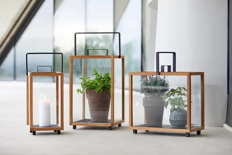 Die Lighthouse Laterne von Cane-line ist das Nonplusultra für jede Terrasse oder Gartenanlage. Die Laterne besteht aus natürlichem Teakholz, pulverbeschichtetem Aluminium und transparentem Hartglas und bietet eine sichere und elegante Möglichkeit, sowohl in Innen- als auch in Außenbereichen eine warme Atmosphäre zu schaffen. Genießen Sie skandinavisches Design und dunkle Nächte, während Sie das sanfte Flackern des Feuers beobachten. Neben einer Laterne kann Lighthouse auch als Mini-Gewächshaus für Kräuter, Kakteen und andere Zimmerpflanzen verwendet werden.