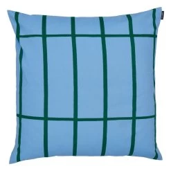 Der Tiiliskivi-Kissenbezug für Außenbereiche von Marimekko trägt ein schlichtes blau-grünes Gittermuster aus dem Jahr 1952. Wussten Sie, dass das klassische Marimekko-Muster von Armi Ratia, der Gründerin des Unternehmens, entworfen wurde?