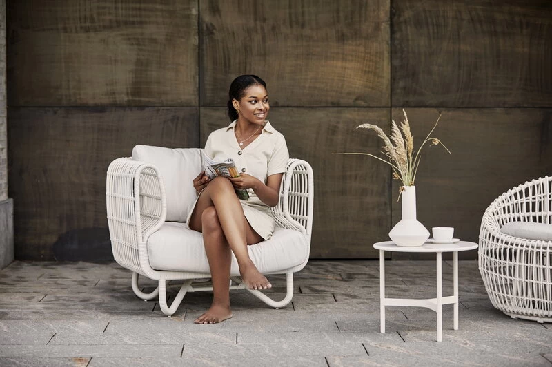 Cane-lines Nest-Loungesessel für den Außenbereich ist ein schönes Beispiel für dänisches Design. Der von Foersom & Hiort-Lorenzen entworfene Sessel ist aus Aluminium und Cane-line Weave gefertigt und mit speziell für den Außenbereich gestalteten Kissen ausgestattet. Cane-line Weave ist eine Faser aus gefärbtem und strapazierfähigem Polyethylen. Das Material ist ideal für den Außenbereich geeignet, da es sehr witterungsbeständig ist und seine Farben und Form über Jahre hinweg beibehält. Stellen Sie den Loungesessel auf Ihre Terrasse, Ihren Balkon oder in den Garten, um eine gemütliche und zugleich stilvolle Leseecke oder einen Lounge-Bereich zu schaffen.