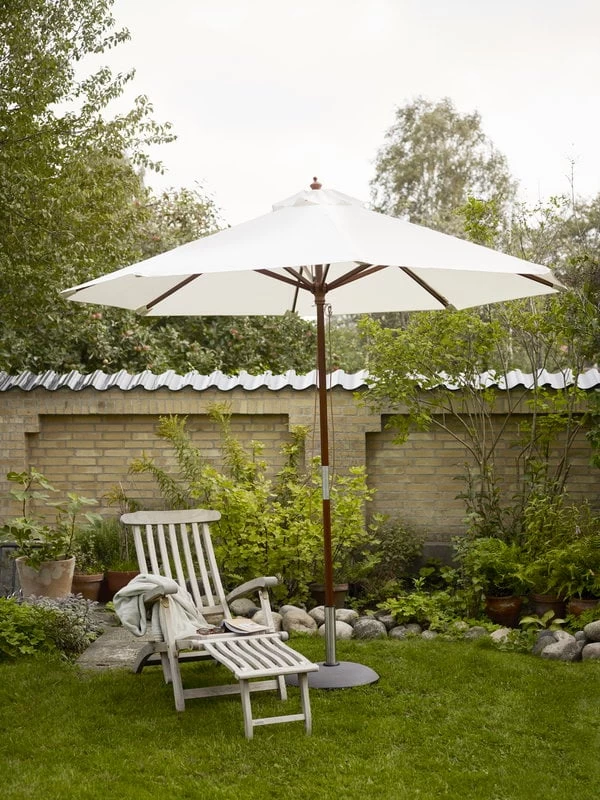 Der Sonnenschirm Catania von Skagerak perfektioniert Ihre Sommeroase mit klassischer Eleganz. Das Gestell des Catania-Sonnenschirms ist aus langlebigem indonesischem Meranti-Holz gefertigt, der Stoff besteht aus naturweißem Polyester. Der Sonnenschirmfuß ist separat erhältlich.