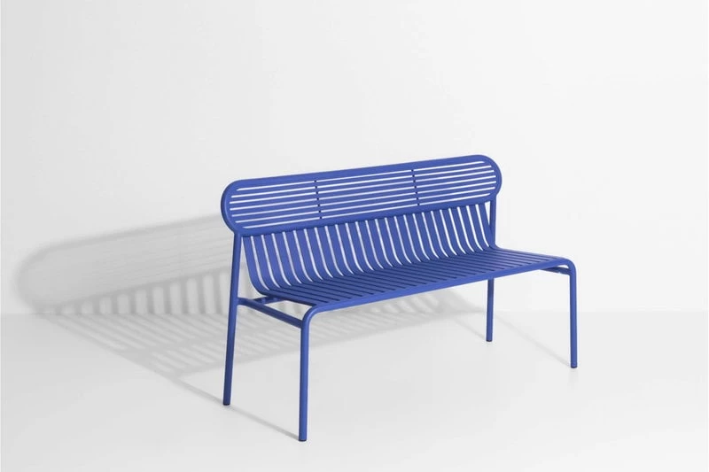 Die Bank Week-end ist Teil der Petite-Friture-Kollektion, die Aluminiummöbel für den Außengebrauch umfasst. Die Bank Week-end zeichnet sich durch ovale Formen mit sowohl horizontalen als auch vertikalen Lamellen an der Rückenlehne aus. Die Bank passt ideal zu den Tischen der Week-end-Kollektion.