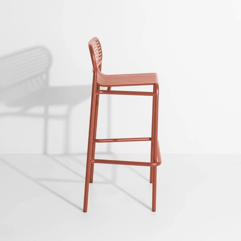 Der hohe Week-end-Hocker ist Teil der Kollektion an Outdoor-Möbeln aus Aluminium von Petite Friture. Er verfügt über ovale Formen und sowohl horizontale als auch vertikale Leisten an der Rückenlehne. Der Barhocker passt ideal zu dem hohen Tisch der Week-end-Serie.