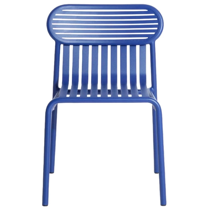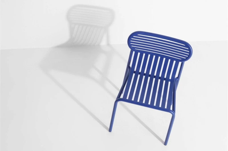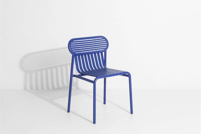 Der Stuhl Week-end ist Teil der Petite-Friture-Kollektion, die Aluminiummöbel für den Außengebrauch umfasst. Der Stuhl Week-end zeichnet sich durch ovale Formen mit sowohl horizontalen als auch vertikalen Lamellen an der Rückenlehne aus. Alle Stühle der Serie Week-end sind stapelbar.